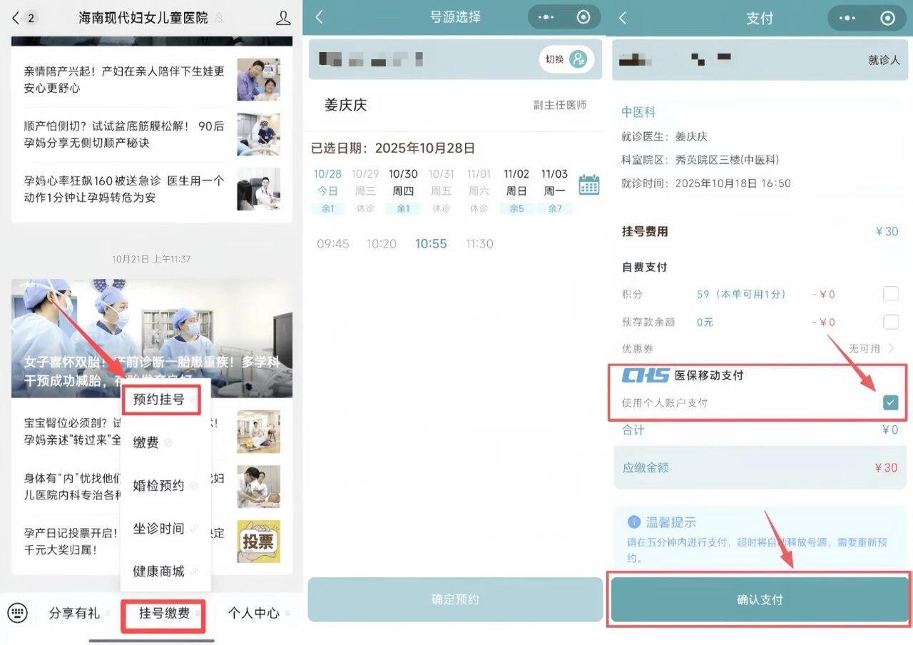 2025年10月15日起,在【海南现代妇女儿童医院】微信公众号/【海南现代】小程序预约挂号,可直接使用医保个账支付诊查费,轻松搞定挂号缴费环节。