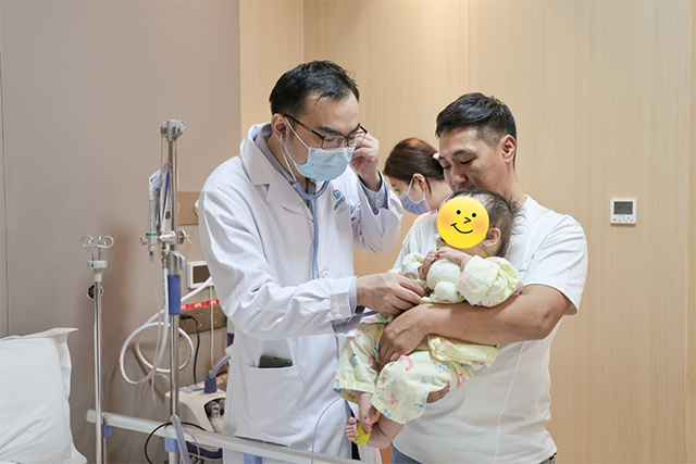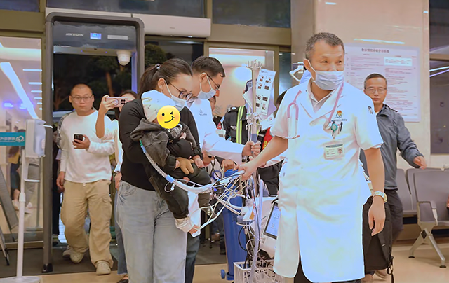 抵达海南海口当晚,医院已安排120救护车、翻译志愿者及单人间病房,为患儿提供安全的就医保障和温馨的就医环境。入院后,马明广主任迅速组织多学科会诊,发现患儿除肺动脉高压外,还存在右心增大、右心功能低下,随即启动“心肺一体化”治疗方案,创新融合"低流量氧疗+雾化辅助"等综合措施,帮助改善宝宝的血氧饱和度。除了专业救治,马明广主任带领的医疗团队更是给予了无微不至的关怀。查房时轻抚孩子手心、耐心安抚焦虑的母亲、协调家属临时住宿……这些细节,让远道而来的家庭在异国他乡感受到安心与温暖。“马主任不仅治好了孩子的病,更治愈了我们的心。”患儿母亲含泪说道。