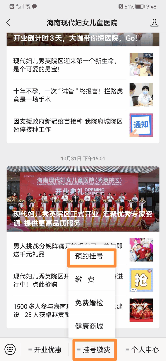 扫描下方【海南现代妇女儿童医院】微信公众号并关注,点击【挂号缴费】菜单-【预约挂号】即可预约看诊。
