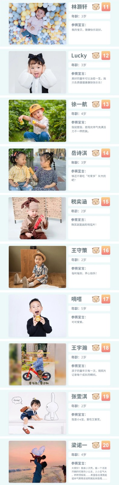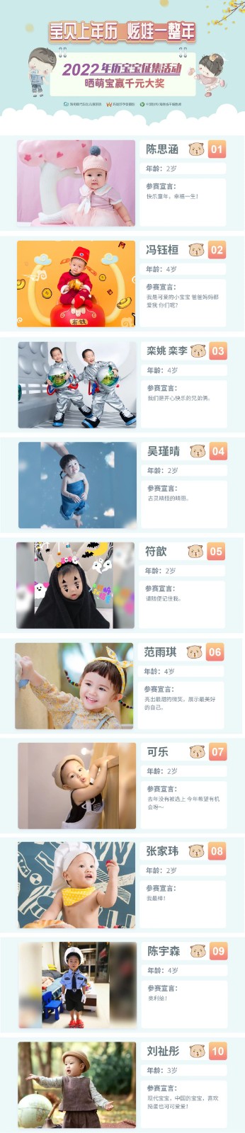 晒萌宝赢千元大奖,海南现代妇女儿童医院2022年历宝宝征集活动简直一呼百应,短短6天就收到160余名宝宝报名参赛,敲可爱的小宝贝相继亮相,小编都要被萌化啦!经过主办方层层挑选,最终20名萌娃进入投票,角逐2022年历宝宝的十二席位,他们个个颜值在线!快来看看都是哪些可爱的宝贝吧!